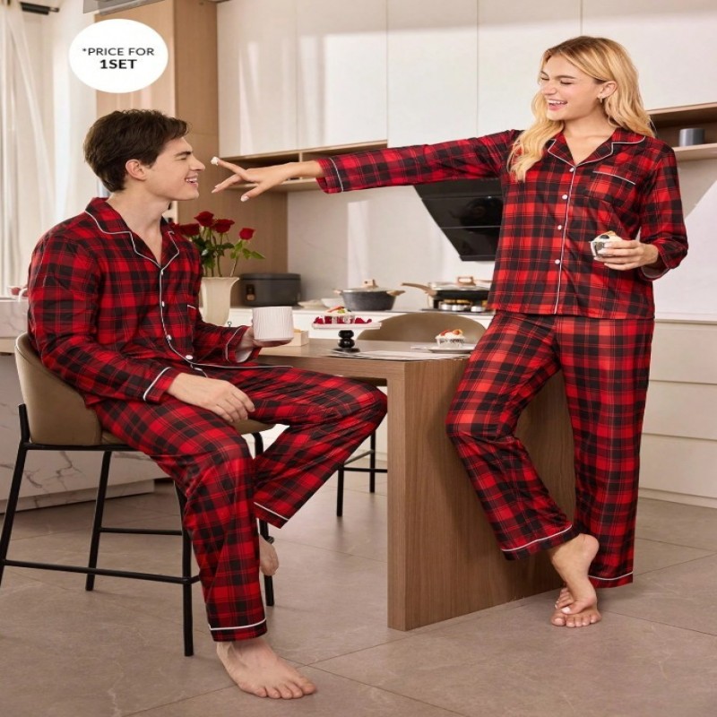CoupledUp Conjunto de pijama casual de manga larga con cuello de solapa y estampado de cuadros para hombres, ropa de otoño/invierno